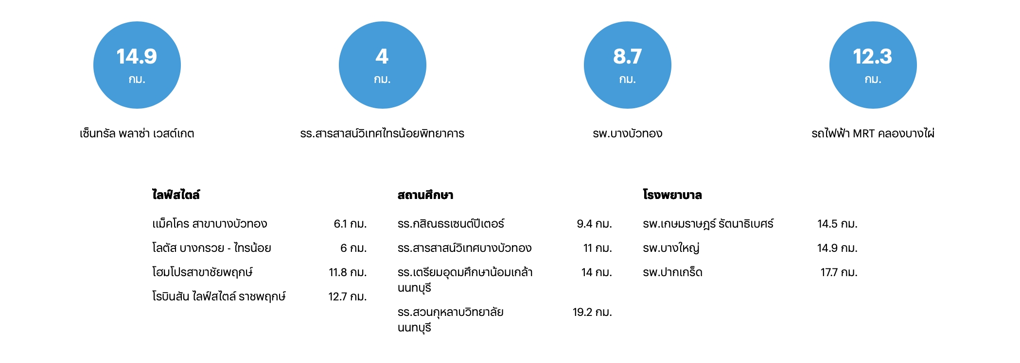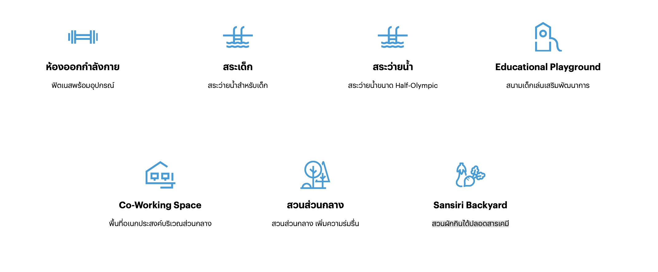 สิ่งอำนวยความสะดวกภายในโครงการ : สระว่ายน้ำขนาด Half-Olympic, สระว่ายน้ำสำหรับเด็ก, ฟิตเนสพร้อมอุปกรณ์, สนามเด็กเล่นเสริมพัฒนาการ, Co-Working Space, สวนส่วนกลาง, สวนผักกินได้ปลอดสารเคมี